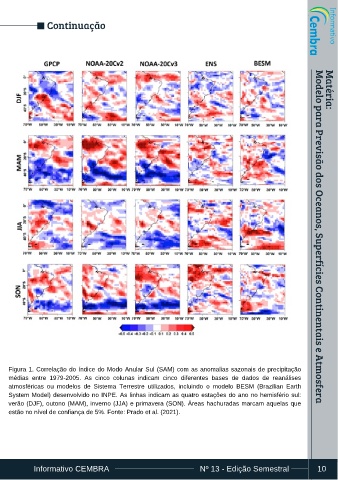Figura 1. Correlação do índice do Modo Anular Sul (SAM) com as anomalias sazonais de precipitação Modelo para Previsão dos Oceanos, Superfícies Continentais e Atmosfera
