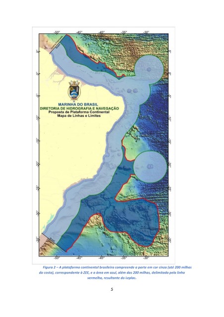 Figura 2 – A plataforma continental brasileira compreende a parte em cor cinza (até 200 milhas da costa), correspondente à ZEE, e a área em azul, além das 200 milhas, delimitada pela linha vermelha, resultante do Leplac. 5